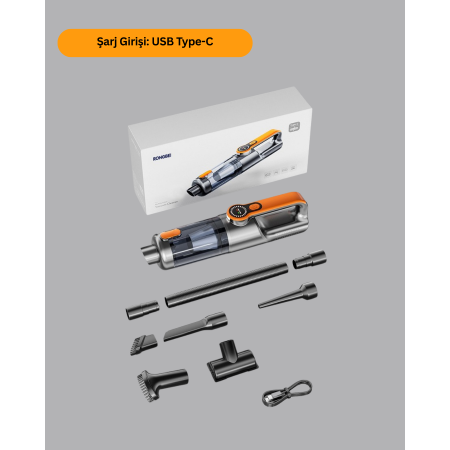 USB Type-C hızlı şarj özelliğiyle cihaz tam dolumdan sonra 25–30 dakika kesintisiz çalışabilir. Kablosuz kullanım özgürlüğü, dar alanlara ve köşelere ulaşmayı daha kolay hale getirir.