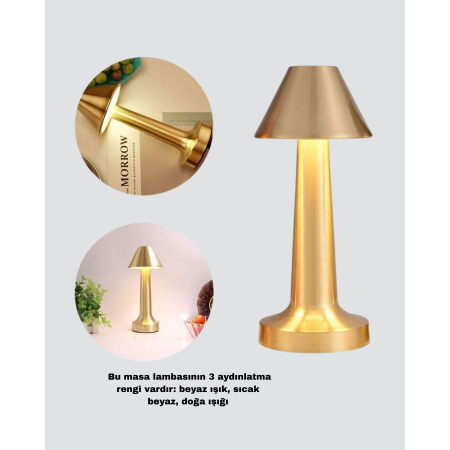 Modern tasarımlı LED Masa Lambası, hem dekoratif görüntüsü hem de çok yönlü ışık seçenekleriyle yaşam alanlarına şıklık ve konfor katar. Lamba; beyaz ışık, sıcak beyaz ve doğal ışık olmak üzere 3 farklı aydınlatma rengi sunar. Uzun basarak kademesiz karartma yapılabilir, böylece ışık seviyesi tamamen sizin ihtiyacınıza göre ayarlanır. Minimum ışık ayarı göz yormayan yumuşak bir ambiyans sağlarken, maksimum seviyede okuma, çalışma veya yemek için yeterli parlaklık üretir. 1800mAh şarjlı pili sayesinde kablosuz kullanım son derece rahattır. USB bağlantısı ile her yerden şarj edilebilir. Metal gövdesi dayanıklılık sağlarken, akrilik abajur ışığı yumuşak ve estetik bir şekilde dağıtır. Kaymaz tabanı sayesinde güvenli bir kullanım sunar. Minimalist endüstriyel tasarımı yatak odası, salon, ofis, kitaplık ve restoran gibi birçok ortamda dekoratif bir tamamlayıcı olarak kullanılabilir.