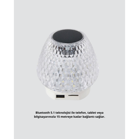 Şık kristal desenli gövdesi, ürünü yalnızca bir hoparlör olmaktan çıkararak modern bir dekor objesi haline getirir. Kendi ışık yansımalarıyla bulunduğu ortama farklı bir hava katan bu hoparlör, hem hediye hem de kişisel kullanım için ideal bir tercihtir.