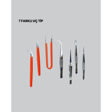 Set içerisinde düz uç, kavisli uç, ince uçlu, eğimli uç ve hassas kaplamalı özel uçlar yer alır. Bu çeşitlilik, çalıştığınız alana göre en uygun cımbızı seçmenizi sağlar. Özellikle telefon tamiri, anakart onarımı, bilgisayar bileşenleri, saat mekanizması, drone parçaları, hassas metal bileşenler ve ince işçilik gerektiren her türlü müdahale için ideal bir çözümdür. Küçük vidalar, jumper kablolar, mikro bileşenler, lehim detayları ve hassas objeler üzerinde yüksek stabilite ve tam kavrama sağlar.