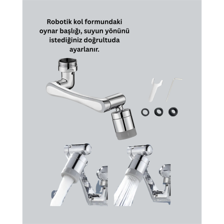 Bu 1080° dönebilen musluk başlığı, geleneksel muslukların sunduğu sınırlı hareket alanını genişleterek kullanıcıya maksimum kontrol sağlar. 3 eklemli robotik kol tasarımı sayesinde musluk başlığı her yöne hareket eder; yukarı, aşağı, sağa ve sola kolayca yönlendirilebilir. Böylece musluk artık sadece sabit bir su kaynağı değil, günlük temizlikte aktif bir yardımcı hâline gelir.
