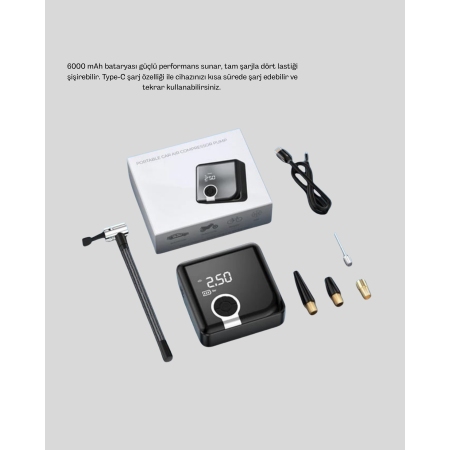 6000 mAh batarya kapasitesi, cihazın tek şarjla dört lastiği şişirebilmesini mümkün kılar. Type-C hızlı şarj özellikli olması, modern cihazlarla uyumlu kullanım sağlar. İhtiyaç halinde powerbank ile bile şarj edilebilmesi sayesinde her ortamda çalıştırabilirsiniz. Ayrıca cihazın üzerinde yer alan LED aydınlatma ve SOS ışığı, özellikle gece yolculuklarında hayat kurtarıcı bir detay olarak öne çıkar.