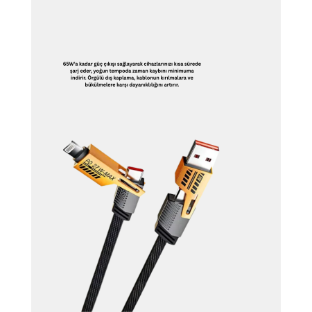 Günlük yaşamın vazgeçilmezlerinden biri haline gelen çoklu şarj seçenekleri, özellikle birden fazla cihaz kullananlar için büyük pratiklik sunuyor. Bu 4’ü 1 arada 65W örgülü hızlı şarj kablosu, hem dayanıklılık hem hız hem de kullanım esnekliği arayan kullanıcılar için ideal bir çözümdür. USB-C ve USB-A bağlantı uçları sayesinde akıllı telefon, tablet, bilgisayar, powerbank, kulaklık ve oyun konsolu gibi birçok cihaza uyum sağlar.
