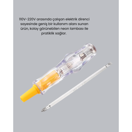 Bu neon ışıklı elektrik kontrol kalemi, 110V–220V aralığında çalışma özelliği sayesinde çok yönlü elektrik kontrollerinde kullanım için uygundur. Elektrik hattında akım olup olmadığını hızlı şekilde anlamanızı sağlayan neon lamba göstergesi, basit tamirat işlemlerinde güvenliği artırır. Neon ışığının parlak ve net görünümü, düşük ışık koşullarında bile rahat bir kullanım sunar. Ev kullanıcıları, ustalar, elektrikçiler ve hobi amaçlı çalışanlar için ideal bir araçtır.